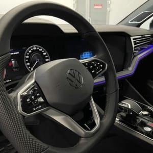 -Мультифункциональное рулевое колесо с кожаной отделкой, обогревом, подрулевыми переключателями и логотипом R-line