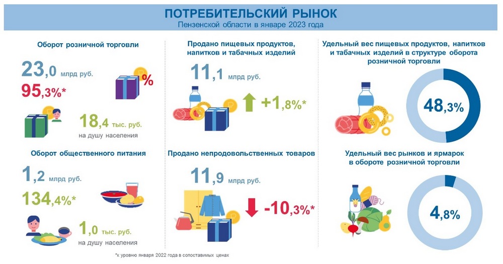 В январе 2023 года оборот розничной торговли составил 23 млрд руб., или 95,3 процента к уровню января 2022 года в сопоставимых ценах.