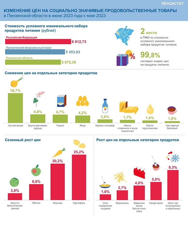 В июне по сравнению с маем 2023 г. индекс цен на продукты питания составил 99,8%. Из социально значимых продовольственных товаров подешевел лук репчатый на 16,7%, крупа гречневая-ядрица – на 4,8, пшено – на 4,7, яйца – на 4,2, молоко питьевое – на 2,0, масло сливочное и мука пшеничная – на 1,7, масло подсолнечное – на 1,4, чай чёрный байховый – на 1,0%. Менее 1% составило снижение цен на свинину (кроме бескостного мяса), рыбу мороженую неразделанную, хлеб из различных сортов муки и хлебобулочные изделия из пшеничной муки, рис шлифованный. Сезонный рост цен на картофель составил 25,2%, морковь – 20,2%, яблоки – 8,8%, капусту белокочанную свежую – 3,8%. Выросли цены на мясо кур охлаждённых и мороженых на 8,3%, сахар-песок – на 5%, баранину (кроме бескостного мяса) – на 4%, вермишель – на 2,7%, соль поваренную пищевую – на 1,6%. Цена на говядину (кроме бескостного мяса) осталась на уровне предыдущего месяца. По стоимости условного минимального набора продуктов питания (из 33 входящих товаров – 24 социально значимые) Пензенская область в июне 2023г. среди регионов ПФО занимает 2-е место (5075,38 руб.). Стоимость набора по Российской Федерации составила 6012,73 руб., по Приволжскому федеральному округу – 5453,83 руб.