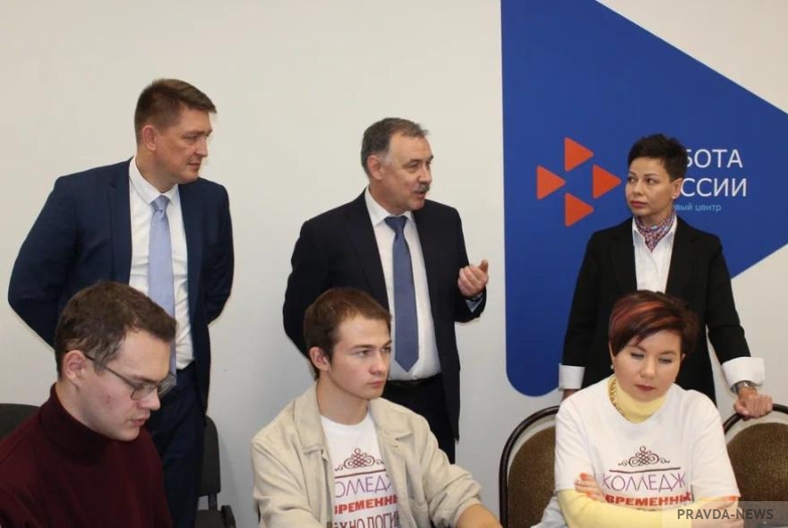 Гостям презентовали опыт работы созданного молодежного клуба Руководитель Роструда Михаил Иванков и начальник Управления осуществления федерального надзора в сфере труда Роструда Дмитрий Демиденко посетили Центр занятост