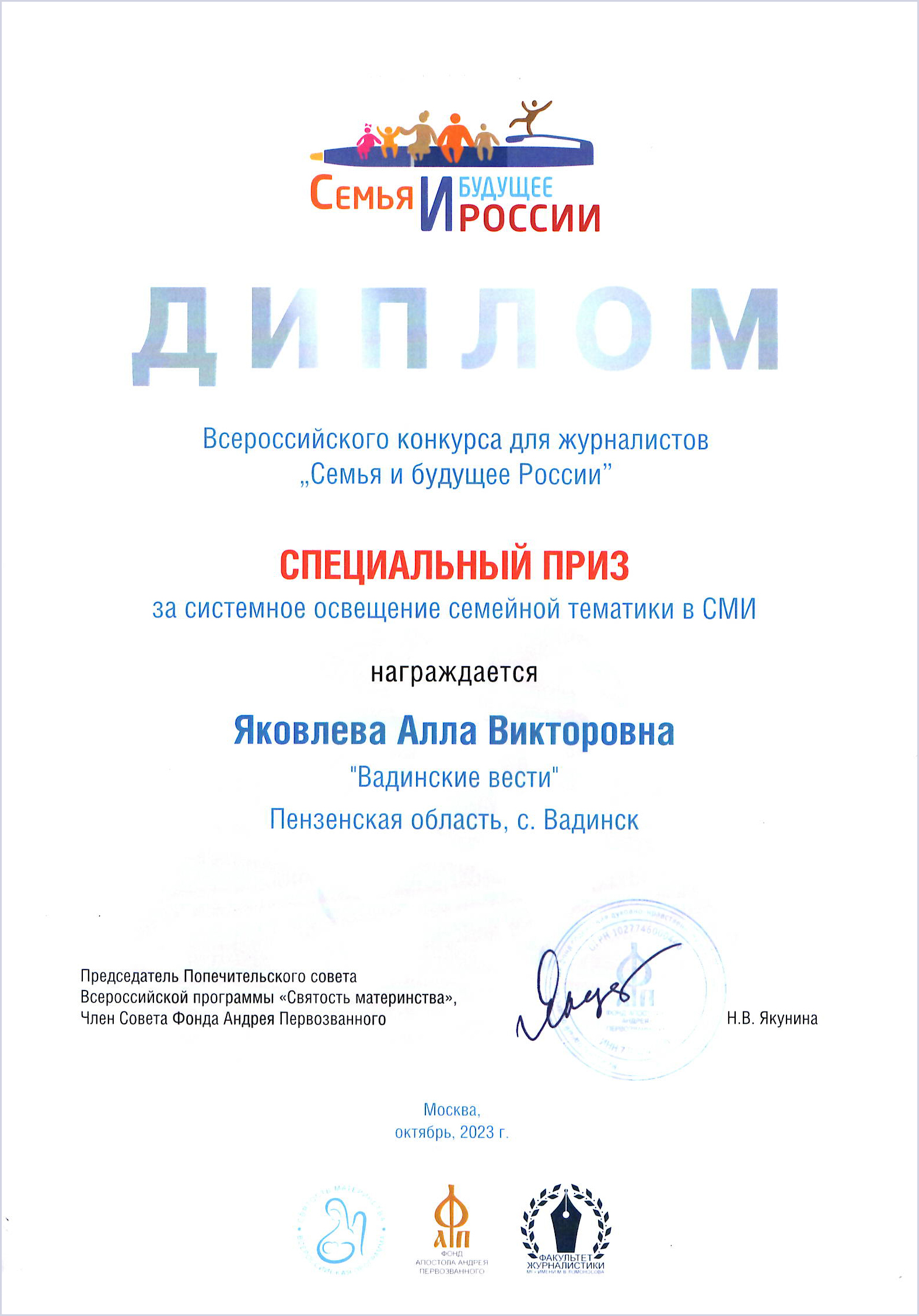 Публикации главного редактора газеты Аллы Яковлевой отмечены специальным призом на Х конкурсе «Семья и будущее России» Фонда апостола Андрея Первозванного.