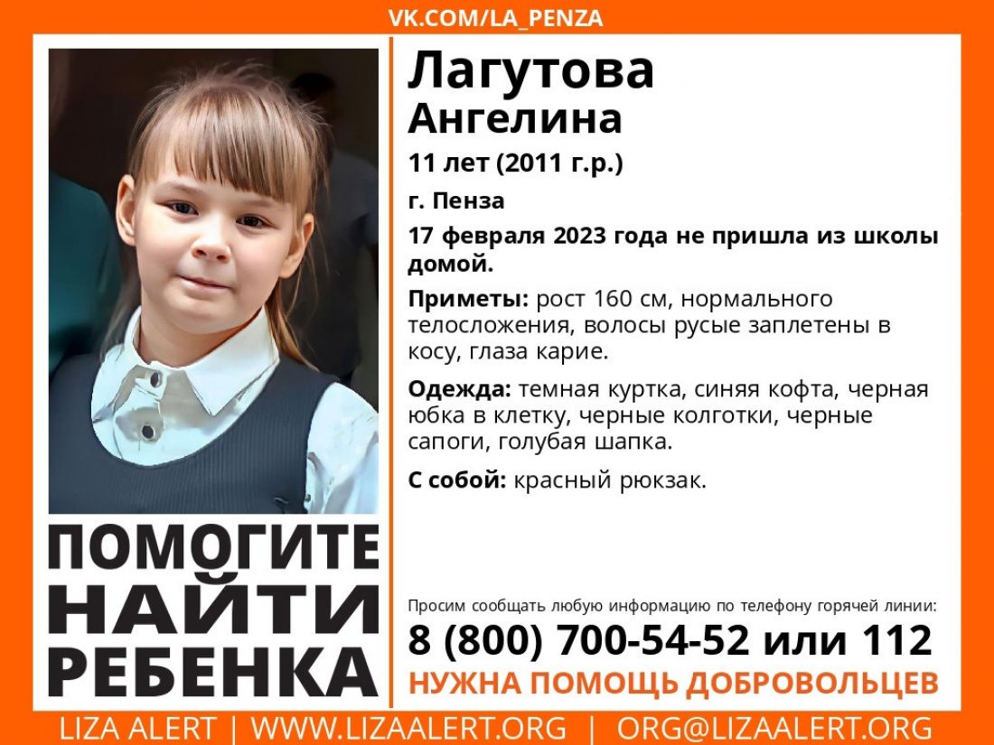 Активисты поискового отряда «Лиза Алерт» сообщили о старте поисков без вести пропавшей 11-летней Лагутовой Ангелины, проживающей в областном центре.
