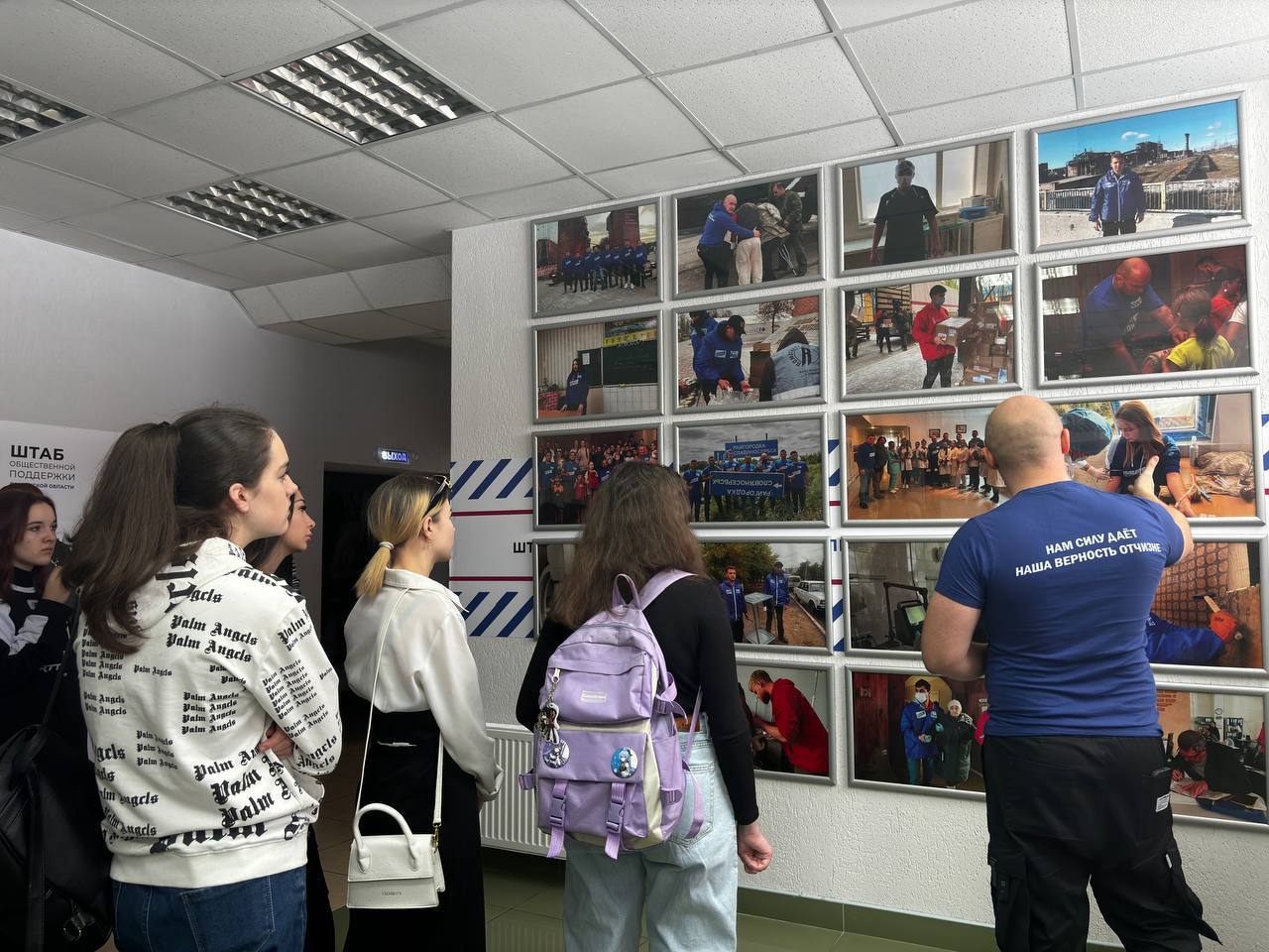 В рамках экскурсии по фотовыставке волонтер гуманитарных миссий рассказал студентам о том, как активисты «Молодой Гвардии» и «Волонтерской Роты» оказывают помощь в новых регионах нашей страны.
