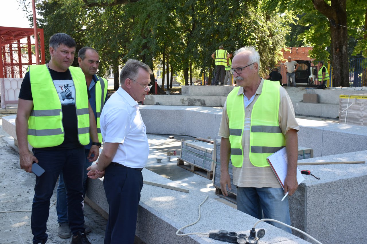 «Пространство вокруг фонтана укладывается плиткой. Скоро будут установлены гранитные клумбы, высажены цветы, установлены скамейки. Самая непростая задача сейчас – монтаж входной группы»,- рассказал градоначальник о ведущихся работах.