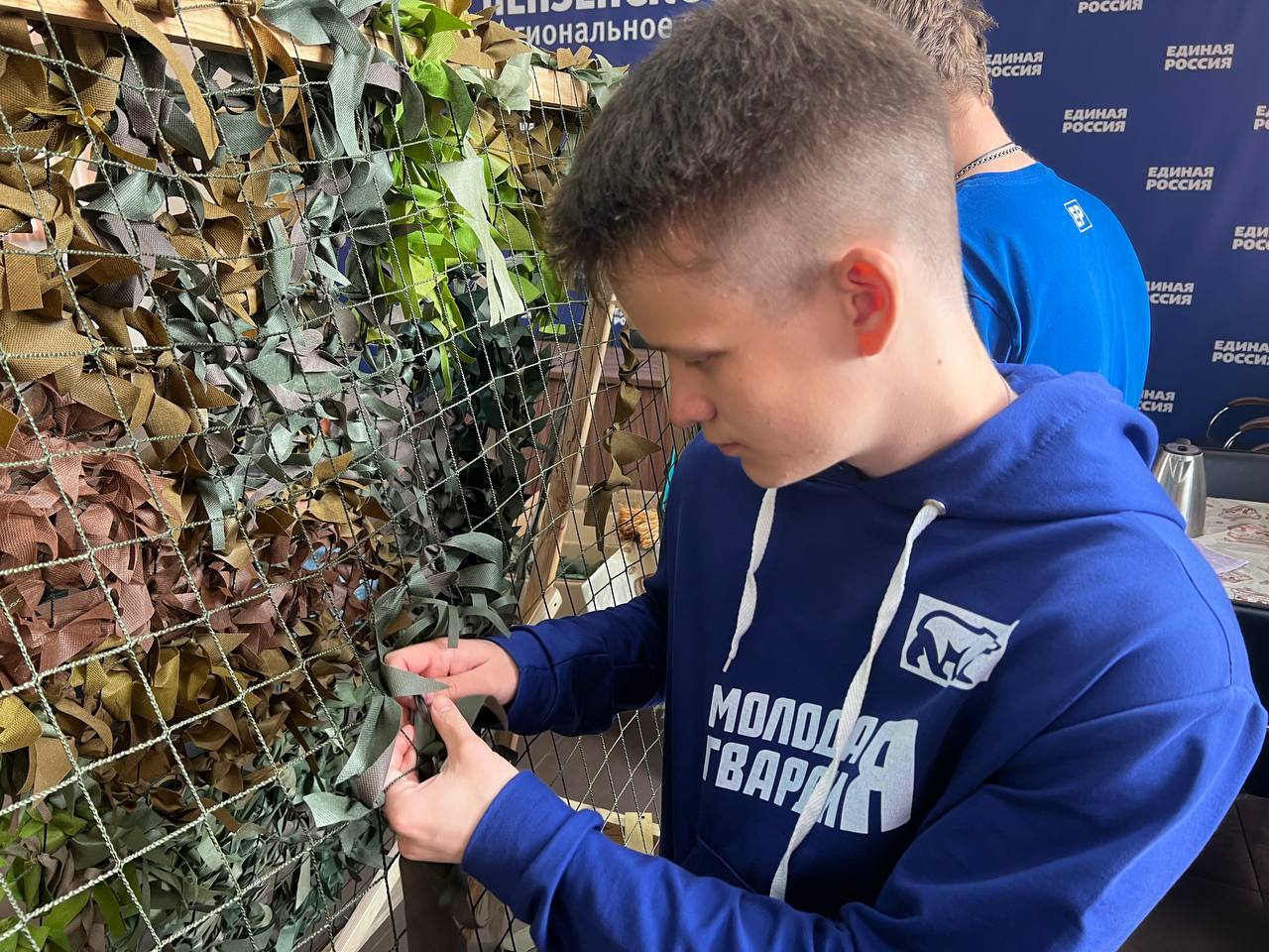 В региональном исполкоме Партии активисты «Молодой Гвардии Единой России» снова принялись за изготовление камуфляжного покрытия для бойцов, которые находятся на территории проведения специальной военной операции
