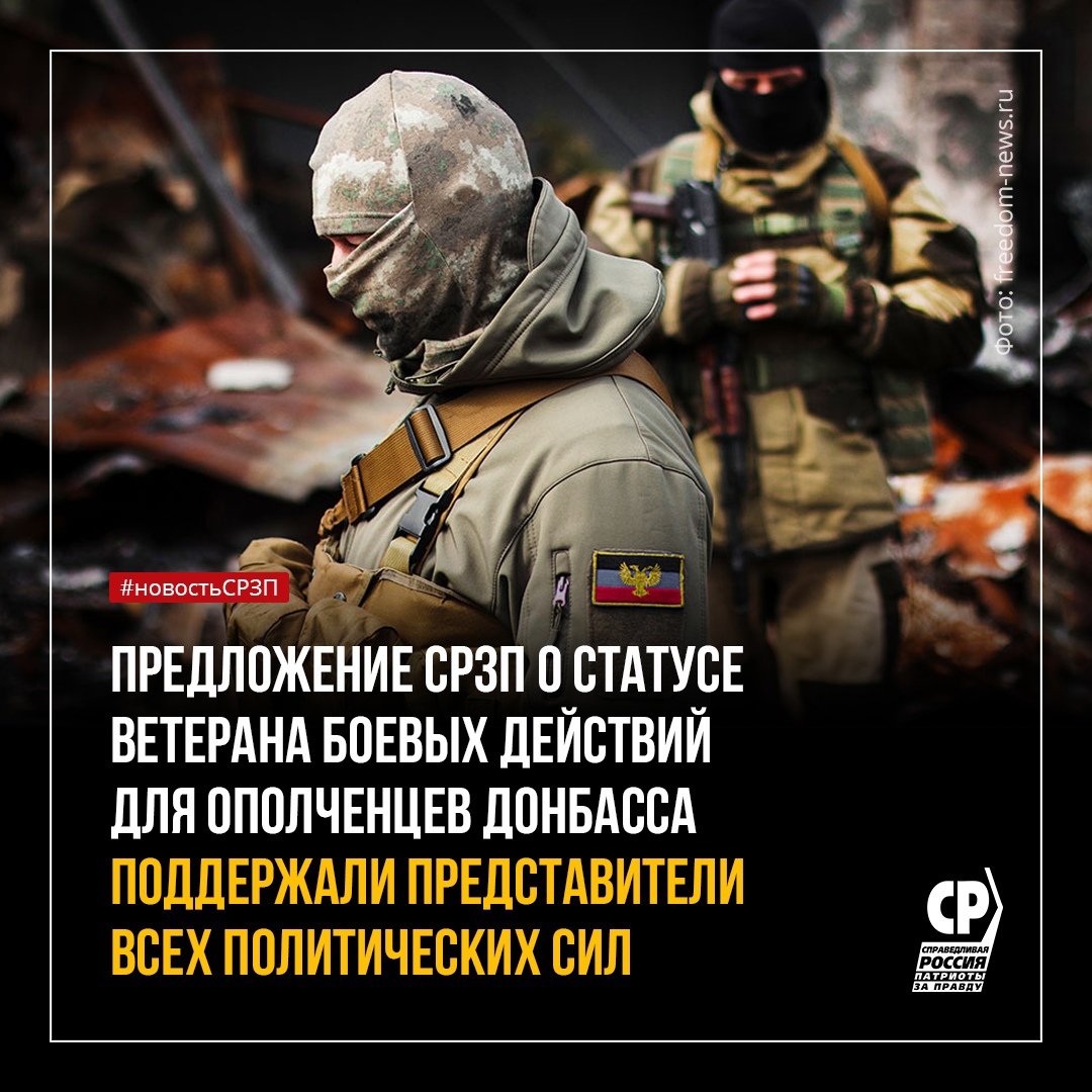 Группой парламентариев, включая сенаторов и депутатов всех фракций, был внесен законопроект о статусе ветерана боевых действий для ополченцев Донбасса. После принятия этой нормы статус ветерана и положенные льготы будут доступны всем, кто защищал юго-восток Украины с 2014 года. СПРАВЕДЛИВАЯ РОССИЯ – ЗА ПРАВДУ уже несколько месяцев настаивает на таком решении. Об этом шла речь и на встрече Председателя СРЗП Сергея Миронова с Президентом РФ.