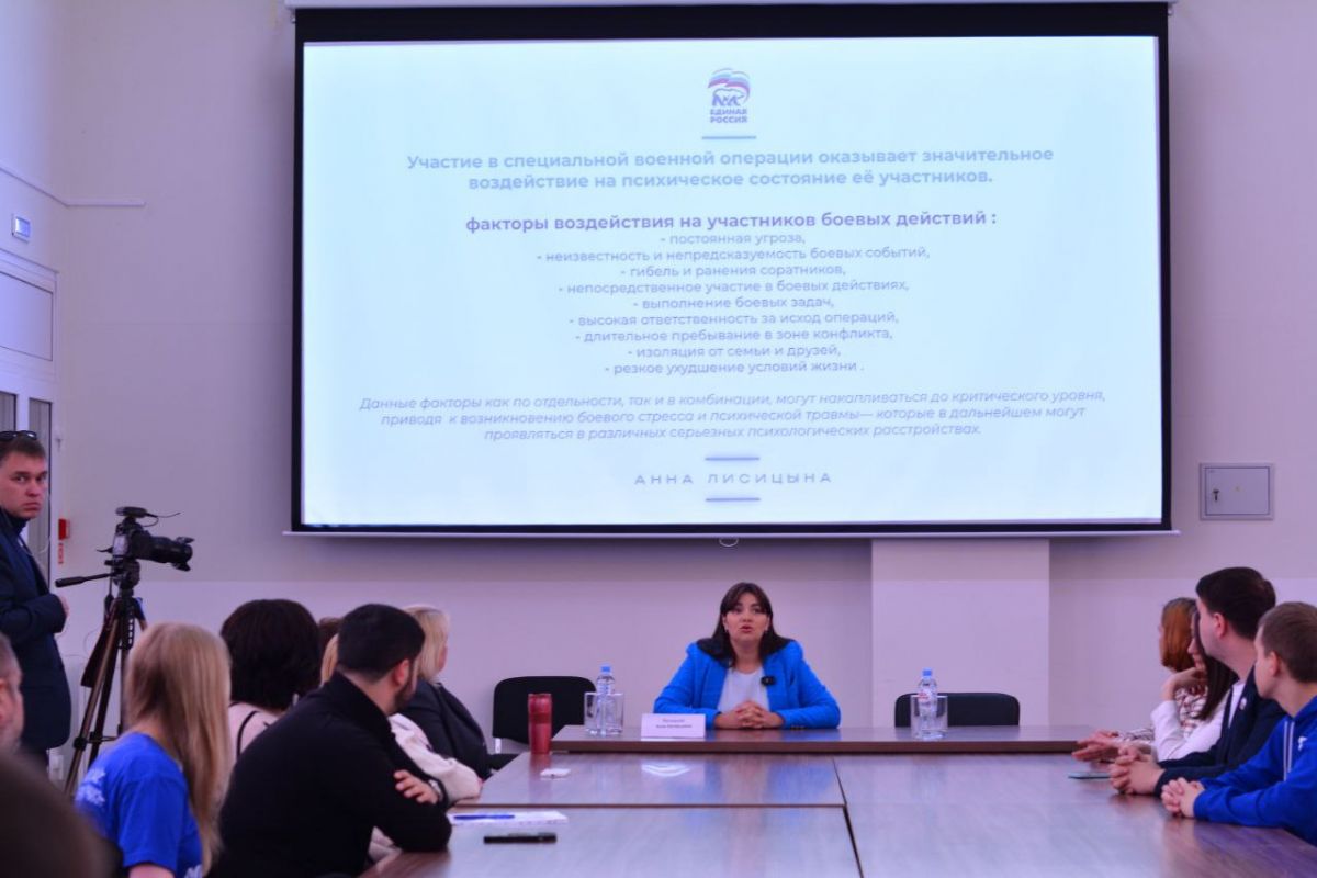 На лекцию «Психологическая помощь и поддержка участников СВО и членов их семей» в Штабе общественной поддержки собрались представители общественных организаций, волонтеры, психологи, члены семей участников СВО, активисты «Молодой гвардии», сотрудники Штаба.