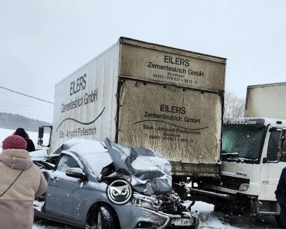Судя по снимку, участниками аварии стали два грузовика и легковушка. Легковой автомобиль в результате ДТП получил серьезные механические повреждения.