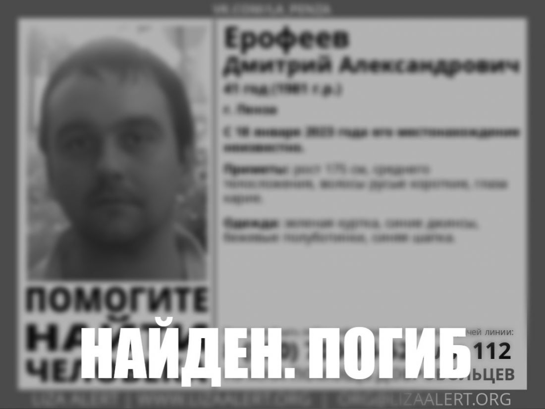 В группе поисково-спасательного отряда «Лиза Алерт» в социальной сети «ВКонтакте» сообщили о завершении поисков без вести пропавшего 41-летнего Ерофеева Дмитрия.
