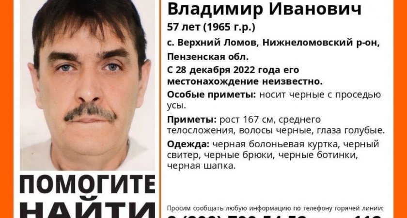 В ориентировке, которая размещена в социальных сетях, указывается, что мужчина проживает в населенном пункте Верхний Ломов. О его местонахождении нет информации уже больше недели. Приметы разыскиваемого: среднее телосложение, рост 167 сантиметров, черные волосы, голубы глаза, носит усы. В момент исчезновения он был одет в куртку, свитер, брюки, сапоги и шапку черного цвета.