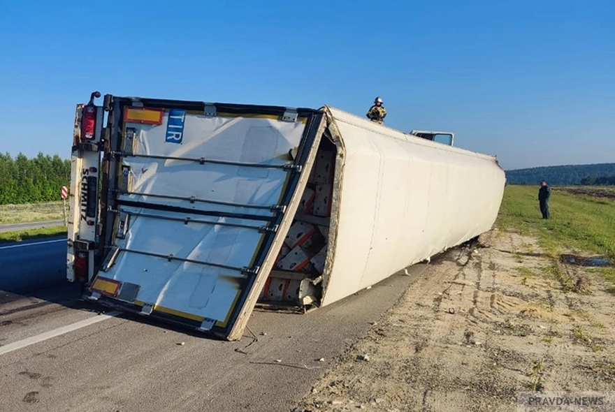 Инцидент случился на трассе «Урал». Фото с места дорожно-транспортного происшествия появилось в одном из сообществ соцсети ВК. На снимке — лежащая на боку фура с поврежденным прицепом.