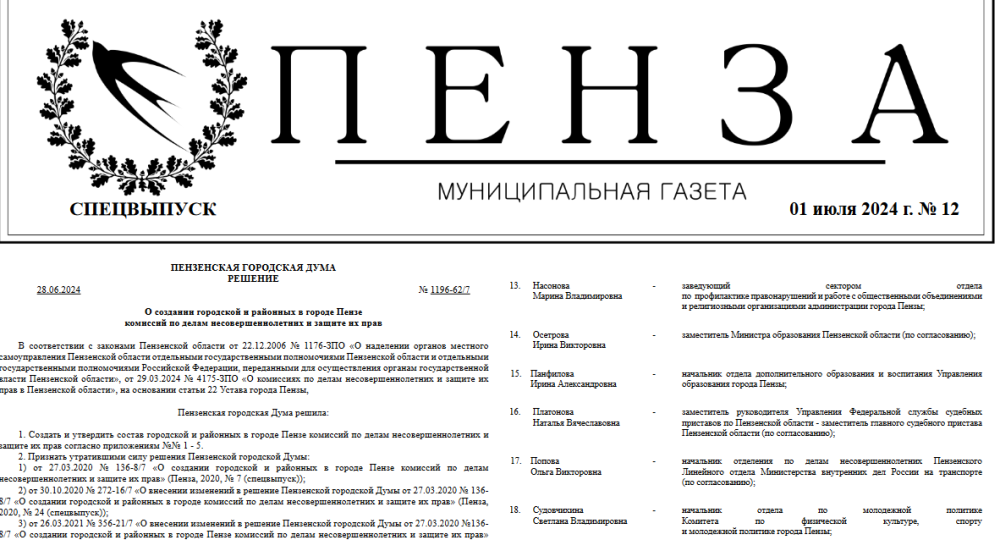 1 июля вышел спецвыпуск №12 муниципальной газеты "Пенза". Газета учреждена Пензенской городской Думой в соответствии с Уставом города Пензы.