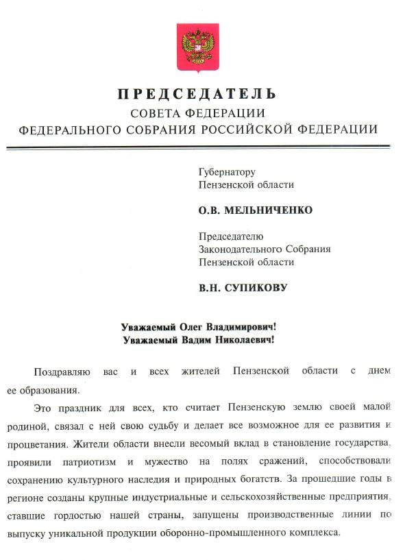 Председатель Совета Федерации РФ Валентина Ивановна Матвиенко поздравила с Днем Пензенской области