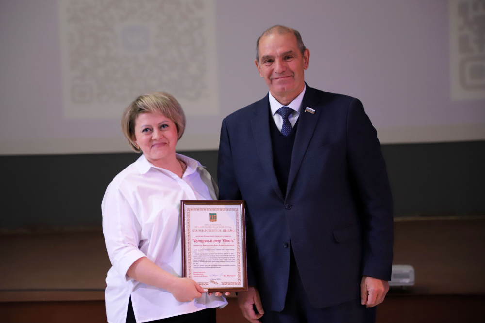 Коллективу Молодежного цента «Юность» за развитие волонтерского движения в областном центре представитель Думы вручил Благодарственное письмо.