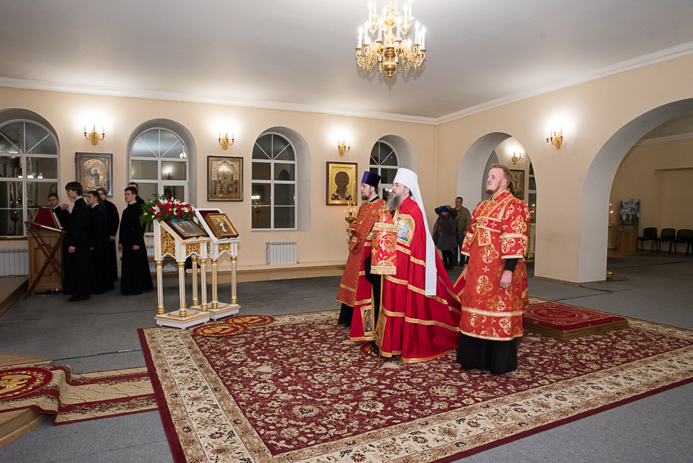 Его Высокопреосвященству сослужили наместник Тихвинского скита Спасо-Преображенского мужского монастыря г. Пензы иеромонах Августин (Зайцев) и диакон Ростислав Горшенев.