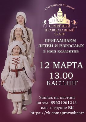12 марта в 13:00 все желающие принять участие в прослушивании в труппу Семейного православного театра приглашаются в Духовно-просветительский центр «Спас» при Спасском кафедральном соборе.