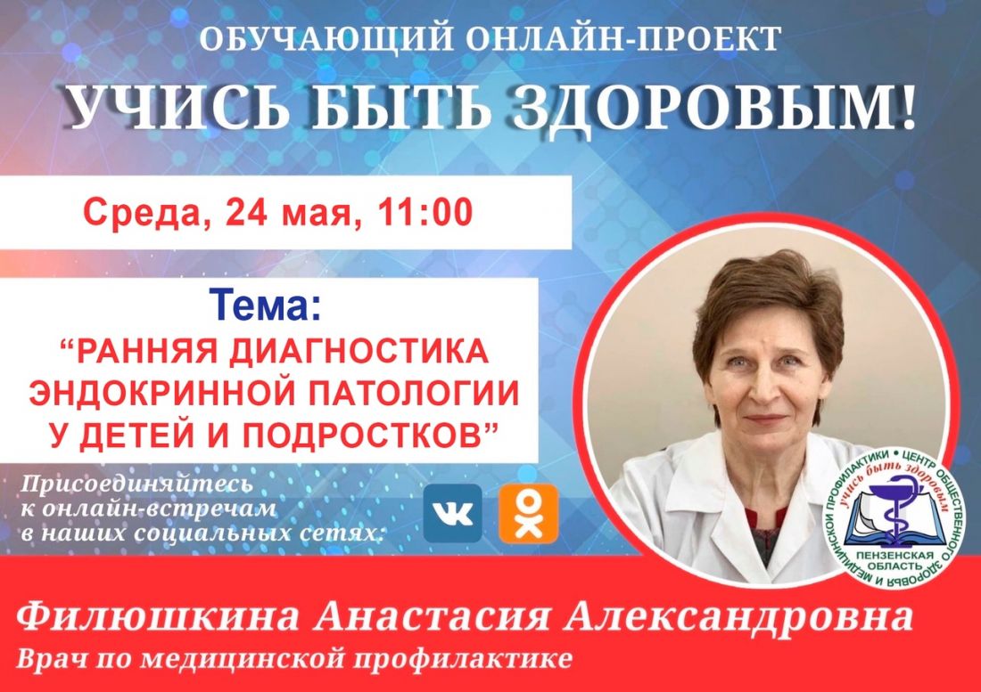 В среду, 24 мая, в прямом эфире онлайн-проекта «Учись быть здоровым!» состоится прямой эфир на тему «Ранняя диагностика эндокринной патологии у детей и подростков».