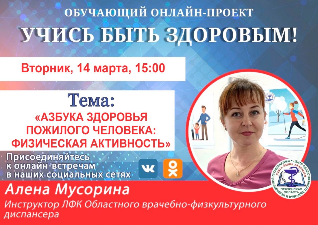 Во вторник. 14 марта, пройдет прямой эфир в рамках онлайн-проекта «Учись быть здоровым!» на тему «Азбука здоровья пожилого человека: физическая активность».