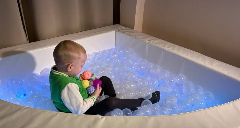 В комнате детям предлагают порисовать на песке, получить удовольствие от «плавания» в сухом бассейне, проследить за рыбками в воздушно-пузырьковой колонне и многое другое.