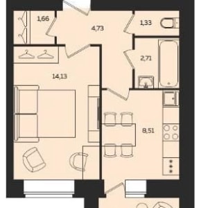 - жилая комната – 14 кв.м., кухня – 8,5 кв.м., гардеробная – 1,66 кв.м.