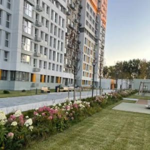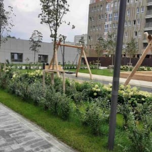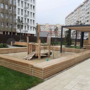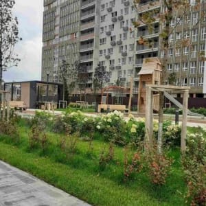 Двор спроектирован дизайнерским бюро «Вещь». Здесь авторское озеленение, умное освещение, спортивные и детские площадки для 3 возрастных категорий, зоны отдыха с беседками и шезлонгами, work зона с Wi-Fi, место для барбекю. Фишкой комплекса является квартет арена с эквалайзером на сцене.