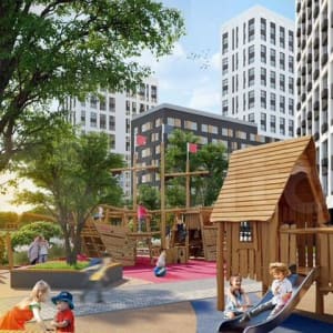 Авторский проект территории комплекса с продуманным до мелочей расположением инфраструктуры. Все дворы объединены между собой прогулочными дорожками. Детские площадки для трёх возрастных категорий, многофункциональная игровая площадка и прогулочная аллея.