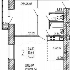 - Общая площадь: 54.4 м²