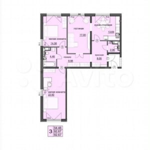 Общая площадь 75.1 кв.м. просторная кухня-гостиная 15,5 кв.м. Три жилые раздельные комнаты по 17кв.м. , 12 кв.м и 11 кв.м.