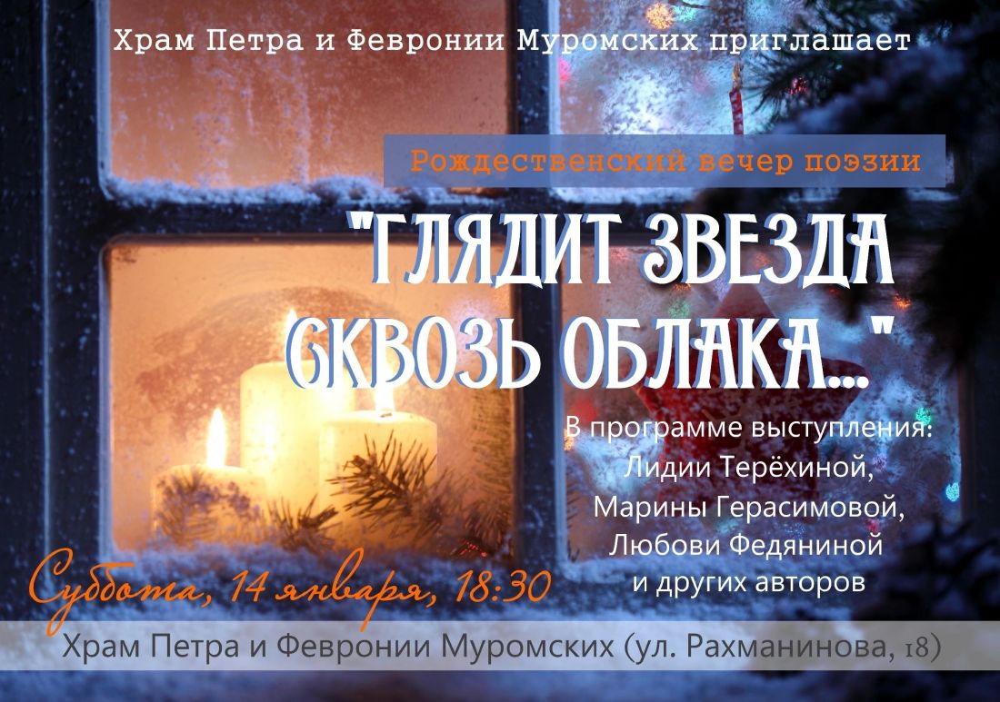 14 января в пензенском храме Петра и Февронии Муромских состоится вечер поэзии «Глядит звезда сквозь облака». Участники будут читать собственные стихи, посвященные Рождеству и произведения на духовные темы.