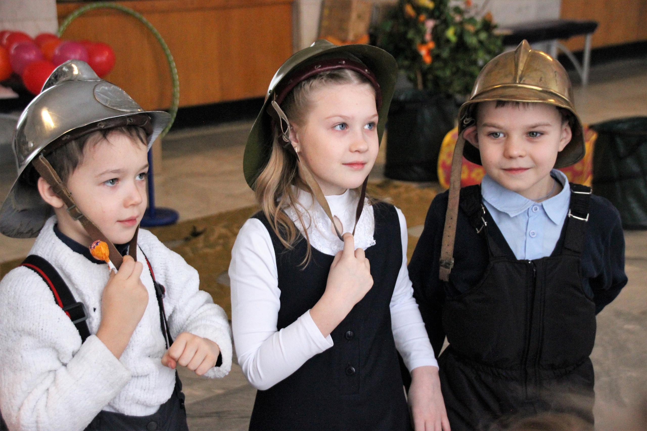 Примерили ребята и пожарные каски из коллекции музейно-выставочной экспозиции 22-го Специального управления. Ребята смогли восстановить последовательность развития экипировки пожарных. Проявили дети и качества настоящих пожарных в эстафете.