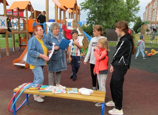 Сотрудники библиотеки №1 13 июля провели познавательно-развлекательную программу «Книги, дарящие знание и свет» на детской площадке м-на «П».