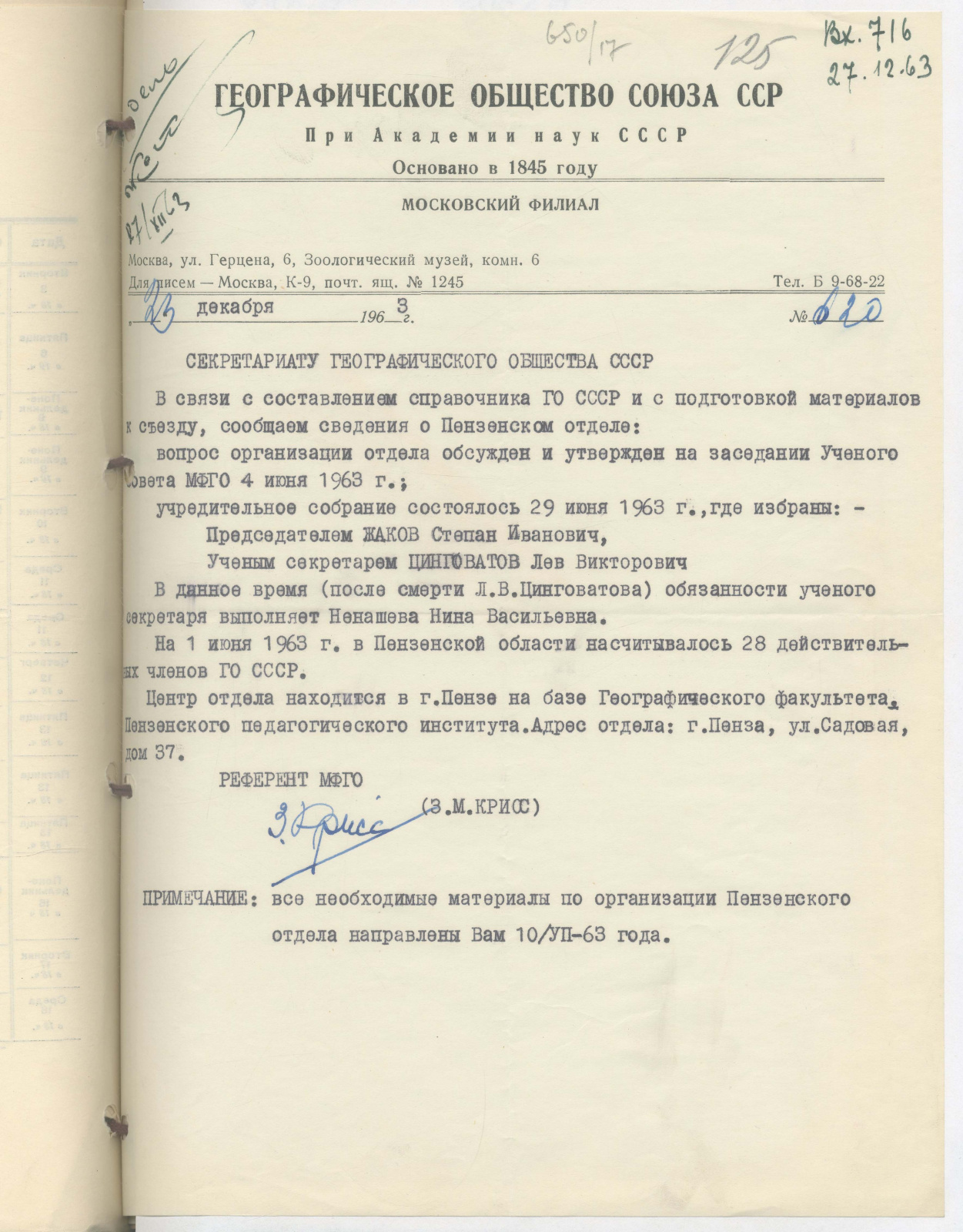 Согласно архивных документов, предоставленных Пензенскому областному отделению РГО - учредительное собрание состоялось 29 июня 1963 года, на котором был создан Пензенский отдел Географического общества Союза ССР. На 1 июня 1963 года в Пензенской области насчитывалось 28 действительных членов ГО СССР. Решение о создании Отдела на базе Географического факультета Пензенского педагогического института было учреждено на заседании Ученого совета МФГО 4 июня 1963 года.