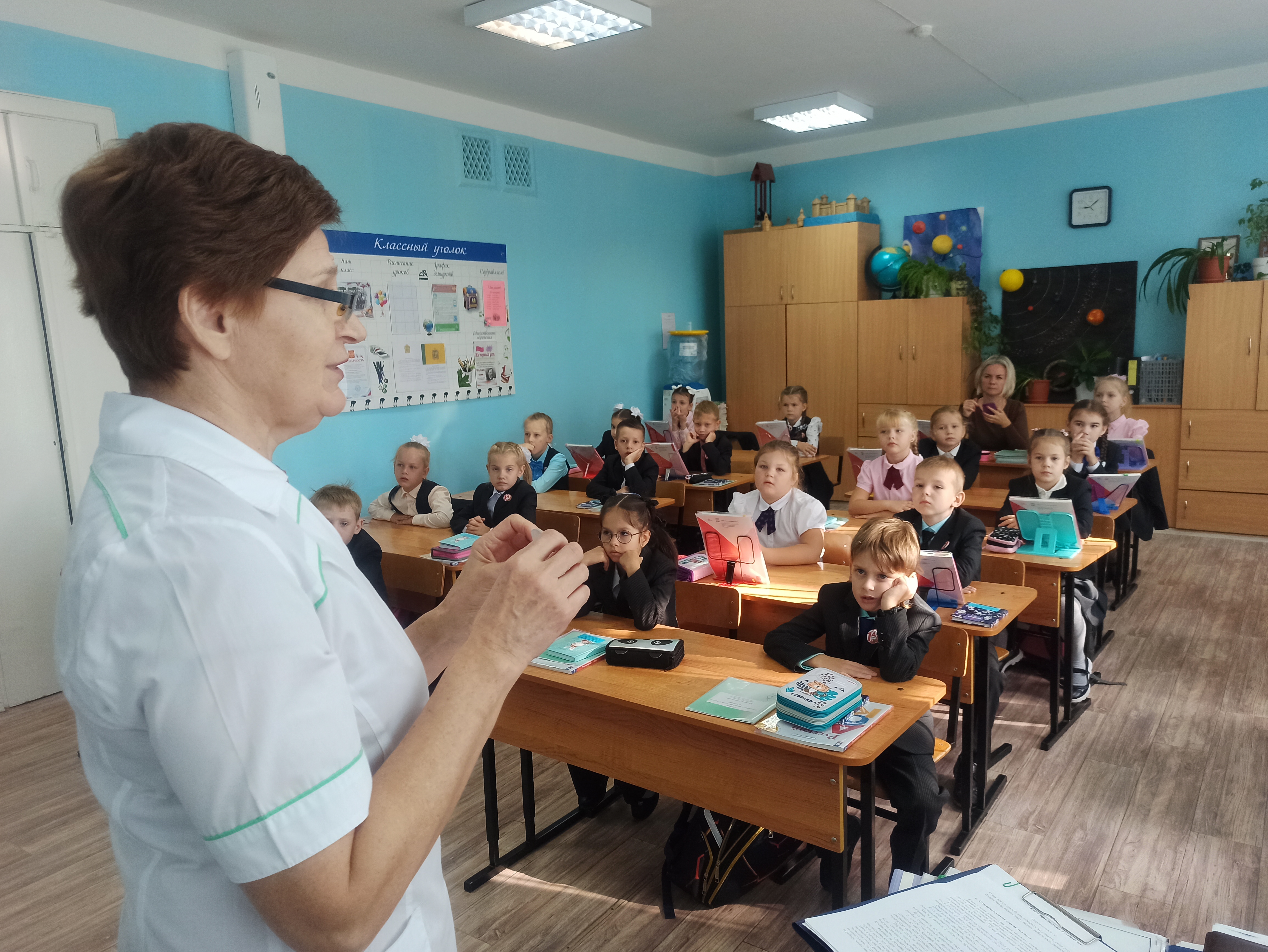 Также специалист рассказала первоклашкам о строении глаза, его оптической системе и защитных приспособлениях, а также о факторах, влияющих на развитие и здоровье зрительного аппарата человека.