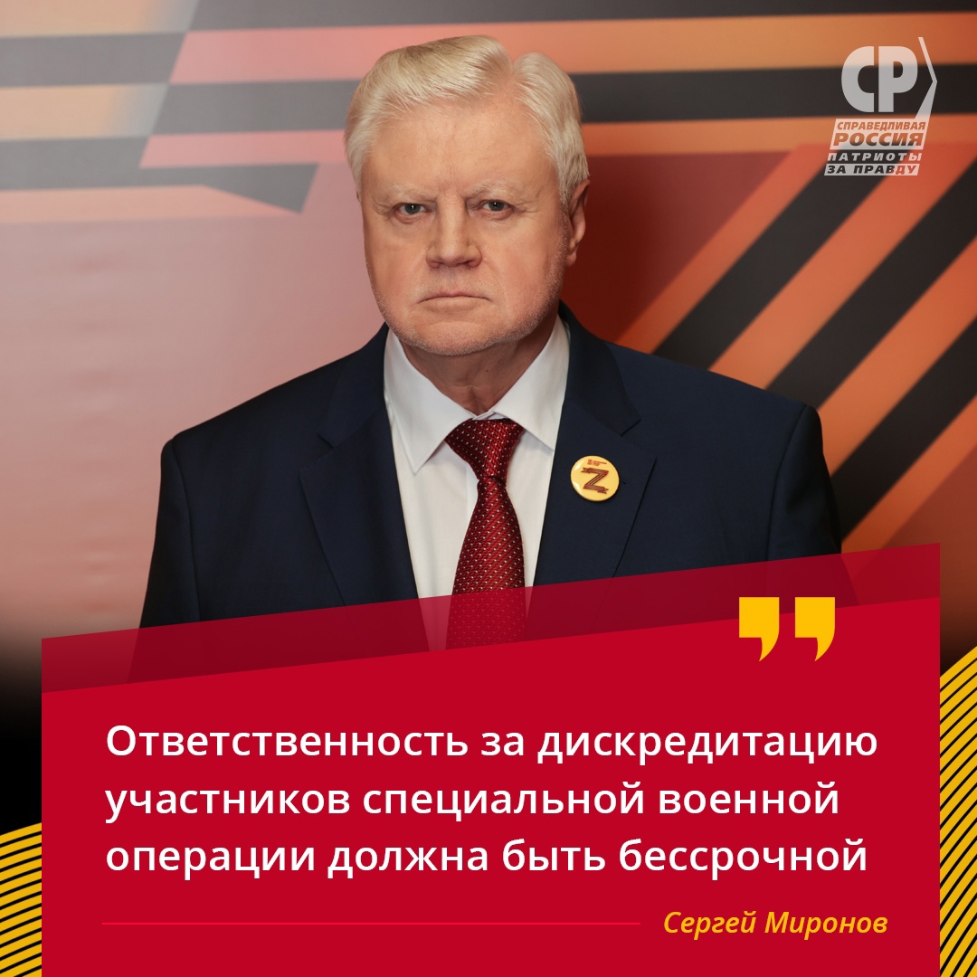 "Главное в этих поправках то, чтобы неповадно было использовать биографию наших защитников, чтобы поставить под сомнение их заслуги. И эта норма должна действовать и после окончания СВО или завершения службы и касаться всех: контрактников, мобилизованных, добровольцев, бойцов ЧВК, в том числе тех, кто погиб с оружием в руках за Родину", – отметил Сергей Миронов.