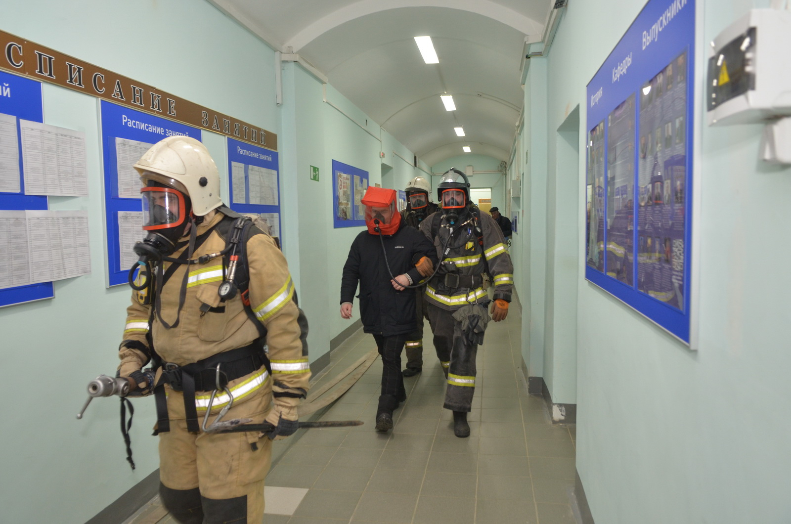 Прибывшие расчеты приступили к развертыванию пожарно-технического вооружения, осуществили тушение условного пожара и вынос двух пострадавших из мест задымления: с третьего этажа аудитории № 307 и помещения отдела ГОиЧС (кабинет №3 106).