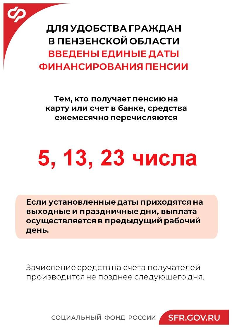 По информации отделения социального фонда по Пензенской области в регионе установлены единые даты перечисления пенсий в кредитные организации: 5, 13 и 23 числа месяца. Если указанные даты приходятся на выходные и праздничные дни, финансирование осуществляется заранее в предыдущий рабочий день.