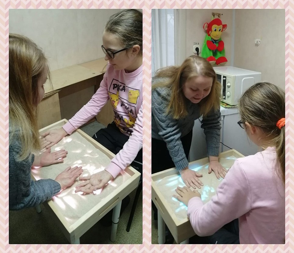 В начале занятия ребенок смог познакомиться с песком, установил эмоциональный контакт с психологом, был проведен ритуал входа в работу. Затем проведена игра «Ладошки», в ходе которой ребенок в сопровождении психолога делали отпечатки кистей рук, прислушиваясь к своим ощущениям, скользили пальчиками по поверхности песка, делали зигзаги, рисовали круги на поверхности песка правой и левой рукой, и двумя руками одновременно. В завершении занятия ребенку было предложено нарисовать свое настроение. В ходе занятия по песочной терапии ребенок может выразить себя на доступном ему уровне, раскрыть свои творческие способности.