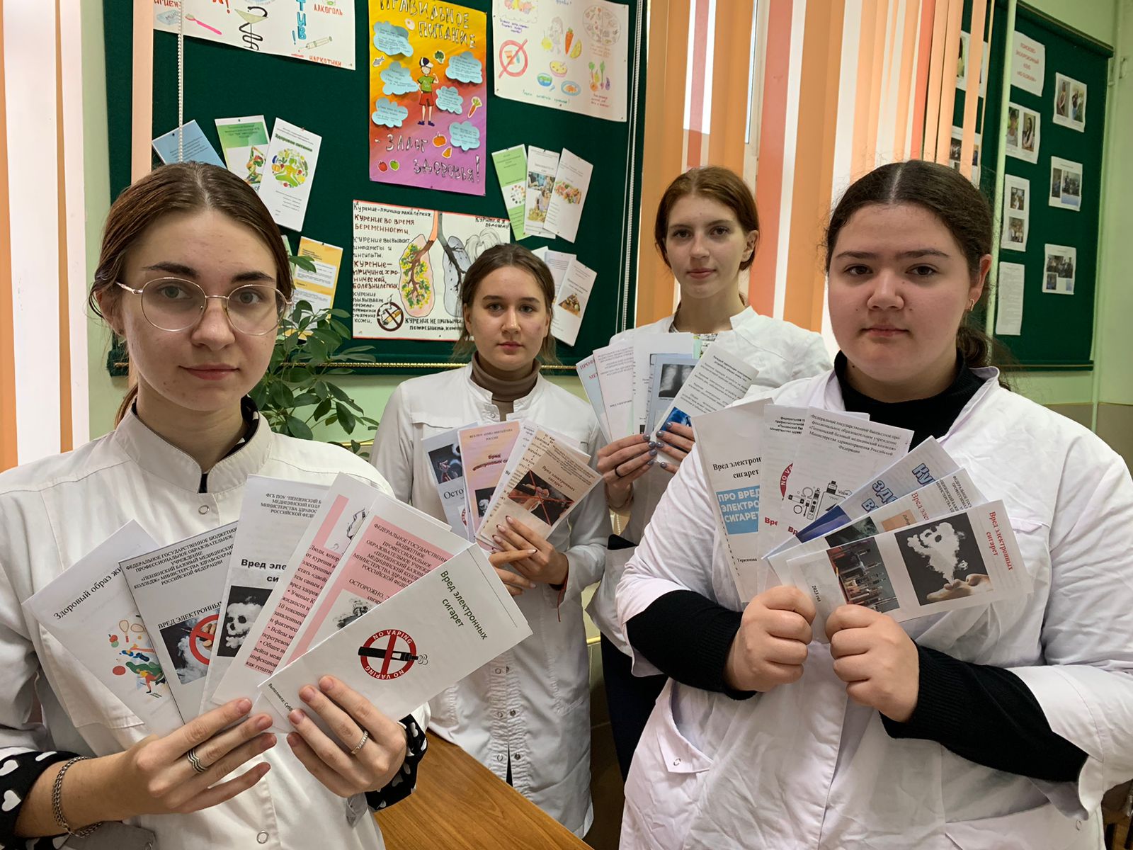Студентами группы 20Л2 и 20Л1 были подготовлены буклеты, где описан состав сигарет и жидкостей для вейпа, как курение и вейпинг влияют на здоровье, и какие болезни могут появиться в будущем. Студенты обсудили вместе с кураторами групп Суховой Л.В. и Корниенко Н.В. проблему распространения этой пагубной привычки в молодежной среде. А также студентам напомнили, что в России вступил в силу закон о запрете на курение кальянов, вейпов и электронных сигарет в общественных местах. Лучшие буклеты были розданы среди студентов колледжа для повышения их информированности.