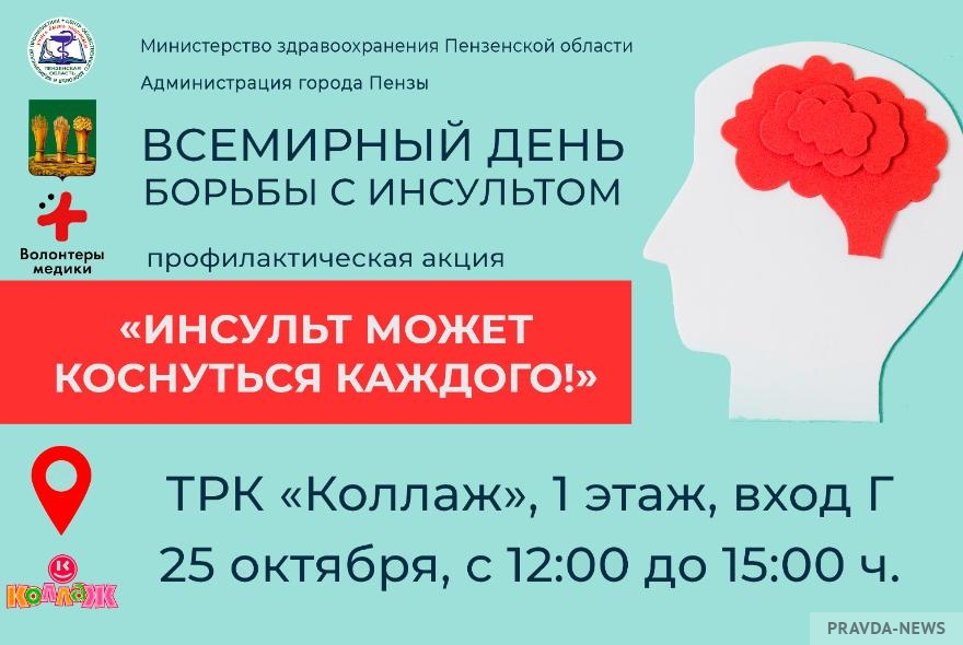 Пензенские врачи вместе с волонтерами-медиками организуют несколько тематических площадок, посетители которых смогут не только узнать достоверную информацию о мерах профилактики, распознавании первых симптомов острого нарушения мозгового кровообращения и порядке неотложных действий, но и оценить собственные риски для здоровья.