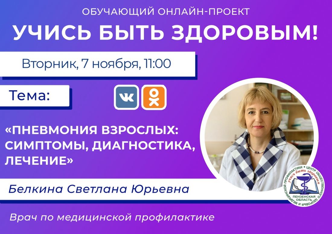 Во вторник, 7 ноября, в сообществе «Пензенская область – территория здоровья» в социальных сетях «ВКонтакте» и «Одноклассники» состоится прямой эфир в рамках проекта «Учись быть здоровым!» на тему «Пневмония взрослых: симптомы, диагностика и лечение».