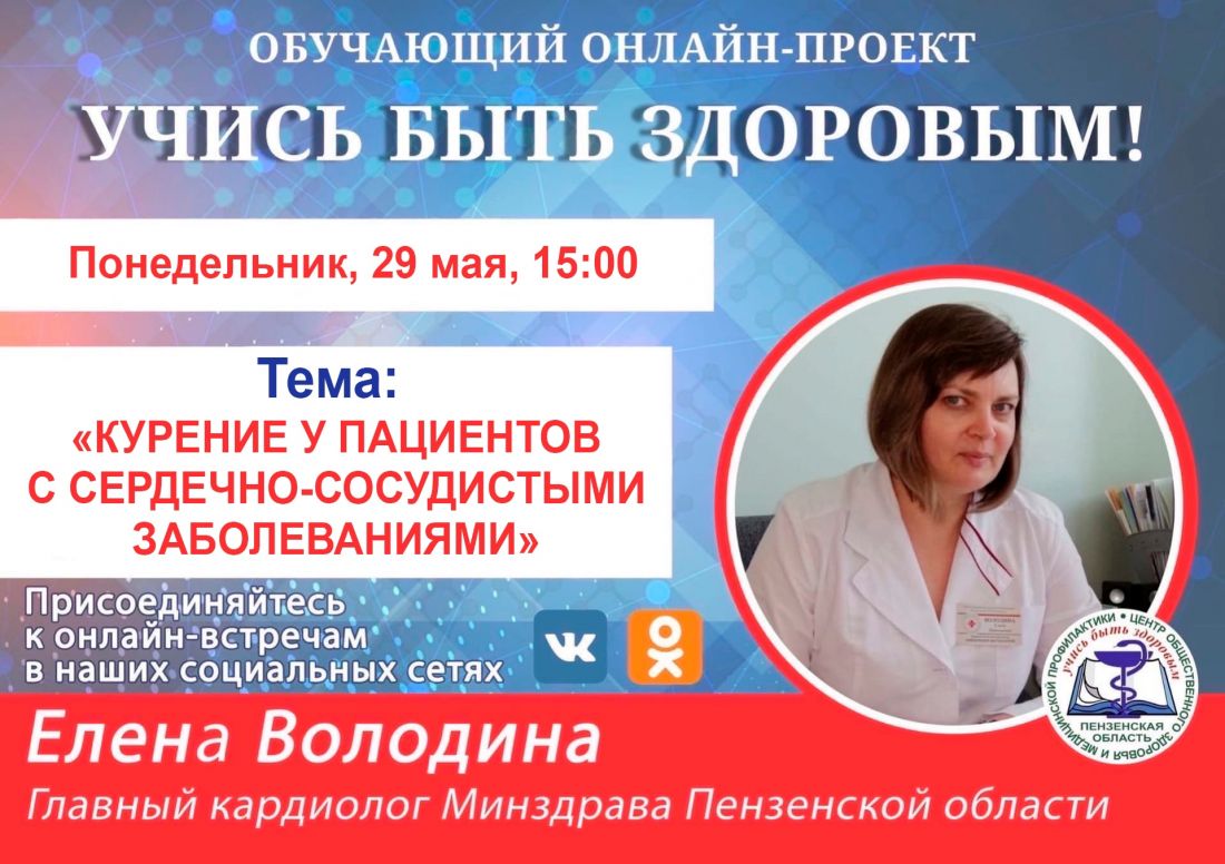 29 мая в Пензе состоится очередная онлайн-трансляция в рамках проекта «Учись быть здоровым!» Главный кардиолог областного минздрава Елена Володина выступит с докладом, который называется так: «Курение у пациентов с сердечно-сосудистыми заболеваниями». Будут рассмотрены различные последствия никотиновой зависимости у таких больных.