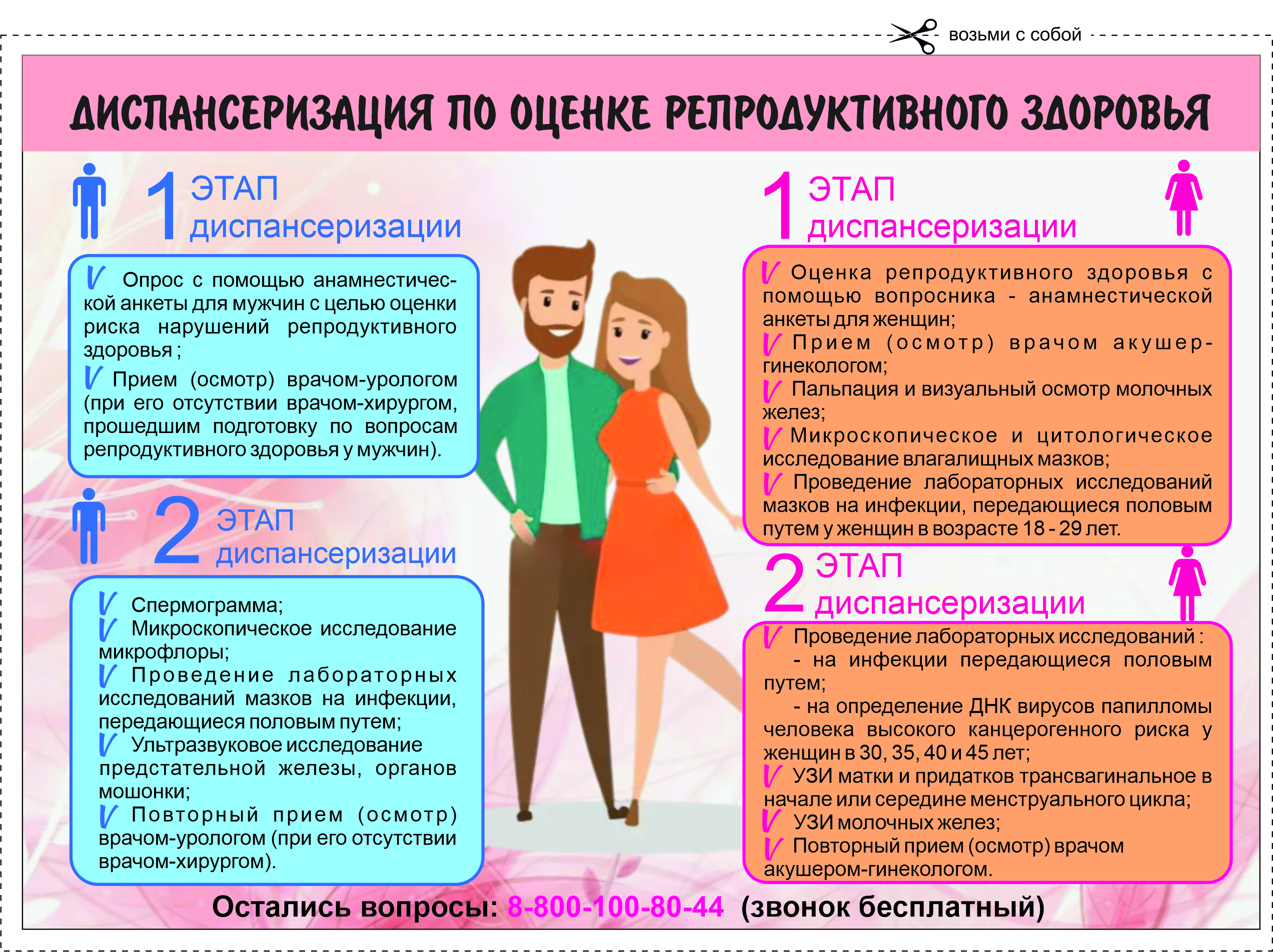 Если у вас остались вопросы по прохождению диспансеризации с целью оценки репродуктивного здоровья, звоните на телефон «горячей линии» Единого Контакт-центра в сфере ОМС: 8-800-100-80-44 (звонок бесплатный).