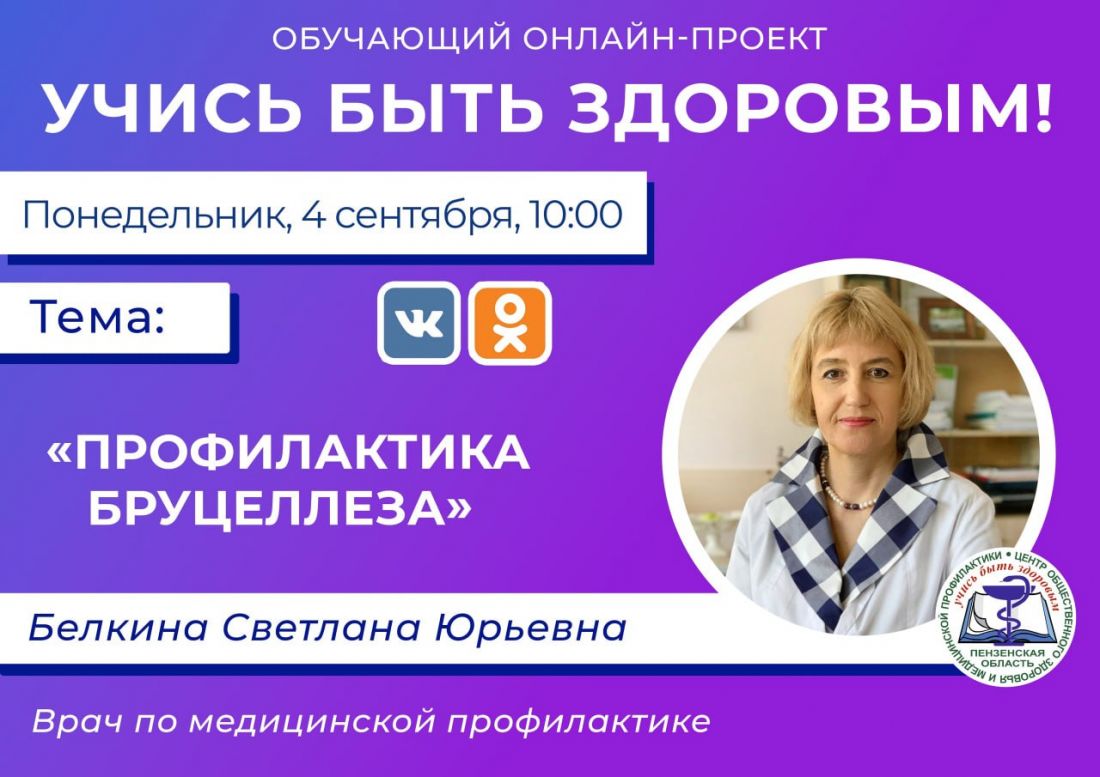 4 сентября в 10:00 врач по медицинской профилактике Светлана Белкина проведет онлайн-трансляцию в соцсетях. Встреча будет посвящено такому грозному заболеванию, как бруцеллез. Медик расскажет пензенцам, где можно заразиться этой болезнью, как ее распознать. Назовет и способы избежать инфекции.